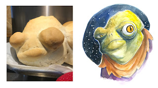 My daughter was helping with the homemade bread, and decided to make the loaves look like frogs. But after the dough rose and they were baked, they looked... like goblins. But since I like goblins too, I decided to draw what I saw.